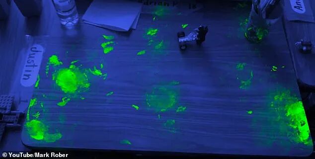 实验材料很简单,是一种叫“Glo Germ”的粉末,用它来模拟病毒,这种肉眼看不见的粉末会在紫外线的照射下发出荧光,分外醒目。