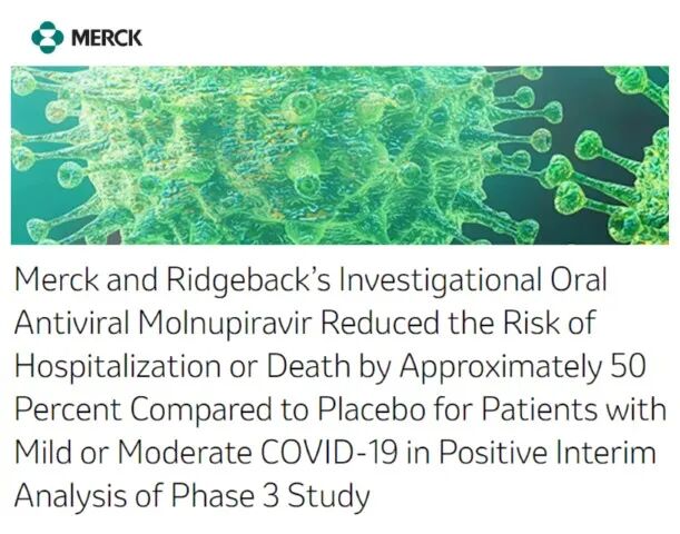 默克和里奇贝克是在10月1日就此研发新药发布通告的。通告称,III期临床试验中期分析结果显示,莫努匹拉韦可将COVID中轻症感染者转为重症或死亡的风险降低约50%。