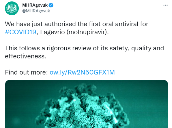 今天,英国医药和健康产品管理局(MHRA)已向口服COVID治疗药物“莫努匹拉韦” (Molnupiravir)发出了世界首份紧急使用授权,用于18岁以上、发生轻至中症COVID-19感染且具有发展重症风险因素的患者(所指风险因素包括肥胖、高龄(60岁以上)、患有糖尿病或心脏病等慢性病)。