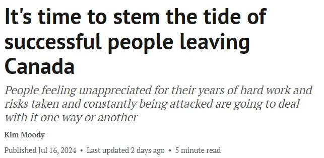 [color=rgba(0, 0, 0, 0.9)]税收也是一个问题。加拿大的个人税率高得吓人,而且最近还提高了资本利得率,并修改了替代性最低税率。因此许多离开的人只是为了将他们的资本部署到其他地方。但总的来说,成功人士离开的最大原因是,他们觉得自己在自己的国家受到了攻击,他们的贡献没有得到认可。 [color=rgba(0, 0, 0, 0.9)]