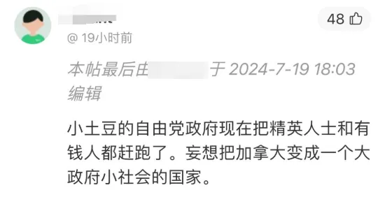 [color=rgba(0, 0, 0, 0.9)]“小土豆的自由党政府现在把精英人士和有钱人都赶跑了。妄想把加拿大变成一个大政府小社会的国家。”