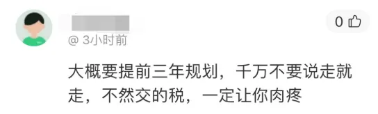 [color=rgba(0, 0, 0, 0.9)]“大概要提前三年规划,千万不要说走就走,不然交的税,一定让你肉疼。” [color=rgba(0, 0, 0, 0.9)]