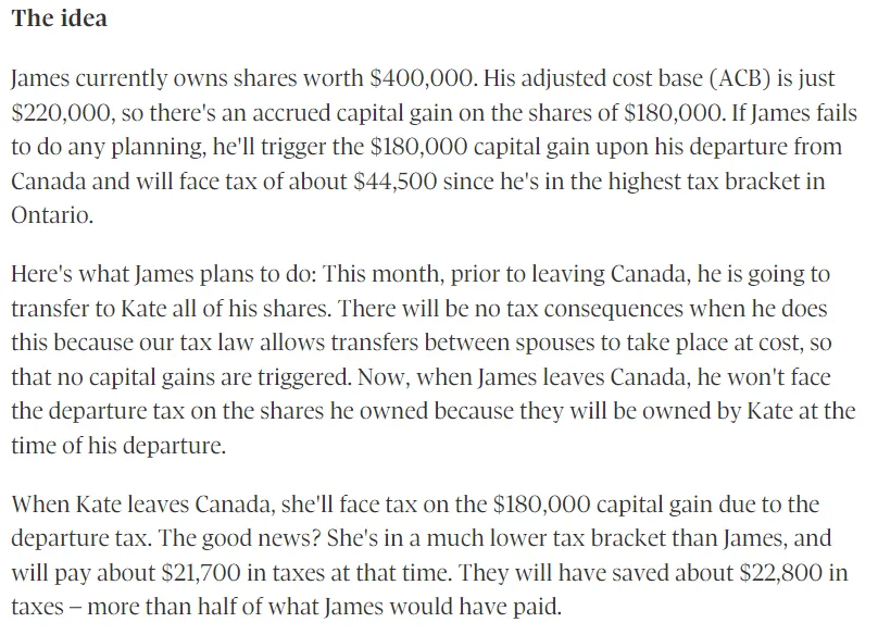 [color=rgba(0, 0, 0, 0.9)]根据Globe and Mail报道的一个真实案例,安省夫妇James和Kate决定彻底移居美国。当时James持有40万加元的股票,他的调整后成本基础 (ACB) 仅为22万加元,因此股票的应计资本收益为18万加元。如果他不做任何规划,他将在离开加拿大时触发18万加元的资本收益,并将面临约4.45万加元的税款,因为他属于安省的最高个人税率。 [color=rgba(0, 0, 0, 0.9)]