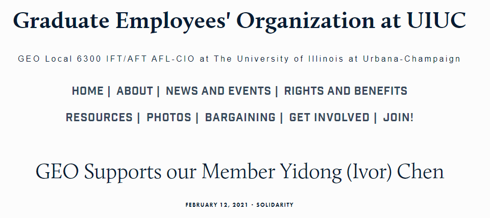 该校研究生组织Graduate Employees Organization(GEO)的负责人表示,学校对Chen的处理,已经算是UIUC对学生最顶天的处罚了。