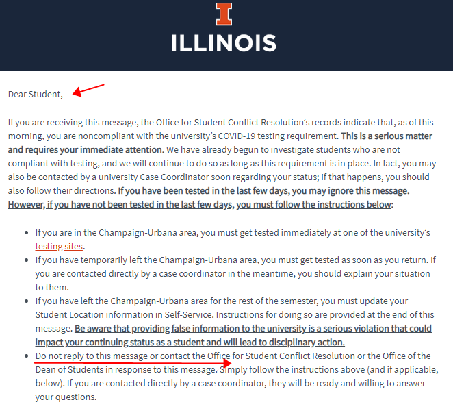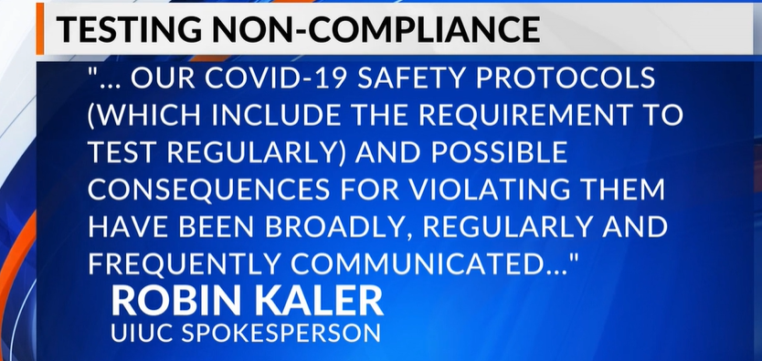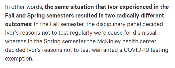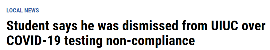 "我是UIUC的一名教职工,大学的Covid检测指南页面中,特别指出了没有来到学校的员工可以免除检测。纪律小组的决定是冷酷的、不必要的、并且与学校自身的既定政策不符。"