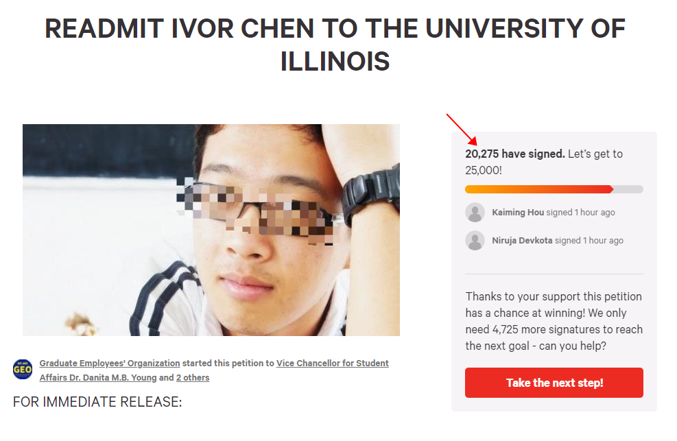 现在在请愿网站上,已经有超过2万人联名请愿,为Chen喊冤,要求学校恢复他的学籍。