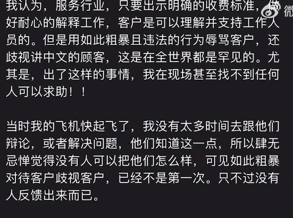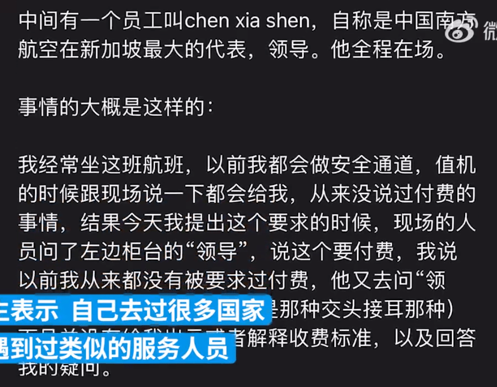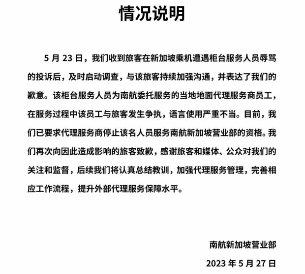 柜台人员辱骂旅客“是狗” 据澎湃新闻等媒体报道,5月27日下午,旅客袁先生称其在新加坡机场南航柜台值机时,被告知调换至安全通道需额外收费,用中文提出质疑后被柜台人员冷漠对待,还被辱骂“是狗”。 网上流传的视频显示,袁先生正在办理从新加坡飞往重庆的CZ546次航班,航空公司一位男工作人员对袁先生说:“你要当自己是一条狗的话,那我可以当你是一条狗。” 随后袁先生有些生气地质问工作人员道:“谁是狗,你说清楚。”结果工作人员强调说:“很容易的。人家在这里解释东西你就来插嘴。” 袁先生再次质问:“谁是狗你说清楚,Say it again,who is dog?”只听到工作人员小声嘀咕道:“做人都不会做。”并没有直接回答袁先生的问题。 袁先生称,5月23日,自己在新加坡樟宜机场乘坐飞往重庆的CZ546次航班,在柜台值机时,因提出希望调换座位至安全通道,被告知调需额外收费。袁先生称自己从未遇到过另付费的情况,所以就想知道缘由,却没想到航空公司的工作人员没有给他任何解释,然后他就跑到柜台,问工作人员会不会说中文,想要解决问题。 据袁先生透露,当时,他听到柜台的工作人员内部沟通都是说中文的,结果当他去问有没有人会说中文时,他们却说自己听不懂中文,拒绝回答他的问题。旁边还有一个女工作人员用中文很生硬地说:“没看到我们在忙吗?”从袁先生当时的观察看,工作人员并没有很忙,值机柜台前只有他一个人在办理业务。 然后,一位男工作人员出来用中文说:“我就是不想回答你。”最后,袁先生用手机拍下了前面视频里发生的侮辱性对话。袁先生还说,这名男工作人员用3种不同的语言说他是狗。 袁先生表示自己去过很多国家,从未遇到过这样的服务人员,事后向南航投诉,至今未有结果。 南航:已要求代理服务商停止该人员服务资格 5月25日下午,南航一位工作人员向澎湃记者表示,确实收到了袁先生对于上述事件的投诉,具体处理情况要到5月27日才能告知。 26日,记者再次致电南航,对方表示该投诉已经转发到境外办事处,事件正调查。 27日晚间,“中国南方航空驻新加坡营业部”微信公众号发布情况说明称:5月23日,我们收到旅客在新加坡乘机遭遇柜台服务人员辱骂的投诉后,及时启动调查,与该旅客持续加强沟通,并表达了我们的歉意。该柜台服务人员为南航委托服务的当地地面代理服务商员工,在服务过程中该员工与旅客发生争执,语言使用严重不当。目前,我们已要求代理服务商停止该名人员服务南航新加坡营业部的资格。 南航表示,将加强代理服务管理,完善相应工作流程,提升外部代理服务保障水平。 网友意见 航空界屡屡爆雷,引来大批网友关注。 很多网友表示要严惩涉事者,并杜绝同类事件发生。 有网友则表示,该旅客的做法本身也值得商榷。 有网友理性分析,不能轻易上升到歧视层面。 还有网友对南航的迅速反应表示赞许。 各位看官,你们怎么看?