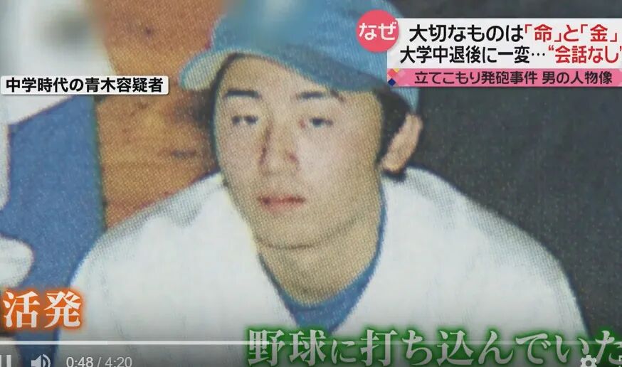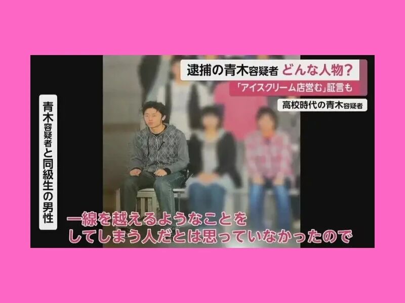 熟悉青木嫌疑犯的中学同学异口同声:「对任何事都视而不见」。“他不主动说话,沉浸在自己的世界。不过学习成绩相当好,体能也非常好,棒球什么的也有积极参加。没听说过有女朋友的传闻。” 在中学的毕业文集中,他以题为“自己想做的事”的作文中提到:“我认为这个世界上最重要的是“生命”。那么,如果被问到第二个是什么的话,我肯定会回答“金”吧。因为在货币经济(以货币为伙伴进行产品交换的经济。)中没有钱的人是无法生存的”。这似乎看上去很讽刺,小时候就懂的道理,长大了怎么就变成杀人狂魔了?