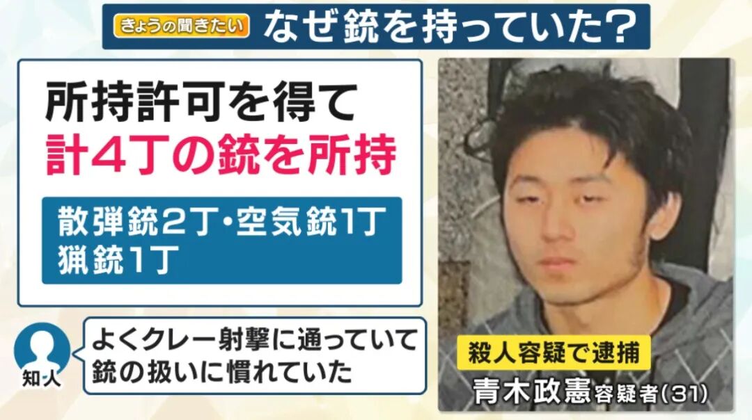 这个杀人动机这么随意吗?这简直是异于常人的精神病患者吧? 可就是这样的人,从县公安委员会那里证实,他是持有猎枪和空气枪的许可的。 青木嫌疑犯还供述说:“大学时代遭遇欺凌之后,我变得不擅长人际关系,就在家一个人做着家业的农业。”