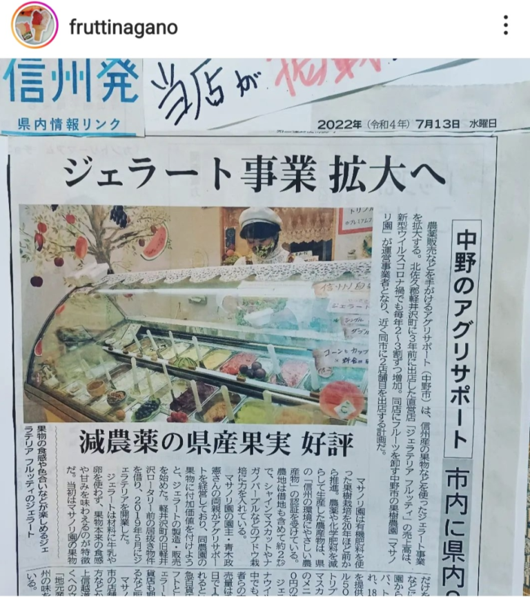 青木家是市内持续13代的果园‘玛莎诺里园’拥有者,果园里栽培了蓝莓、葡萄、苹果、桃子等。据附近的人说,父亲是农协的理事等农业关系的有力者,正道先生自己也成功经营着除了果园之外与农药相关的公司,以及使用自家果园采摘的水果的意式冰淇淋店。 这家意式冰淇淋店除了著名度假滑雪胜地轻井泽店之外,去年夏天在中野市开设了第二家店铺。不使用牛奶就能品尝到果实的味道是卖点,网上的口碑也很好。被称赞为“人生中最好吃的冰淇淋”和“颠覆冰淇淋的概念”。单价500日元,但是生意兴隆到可以在轻井泽排队,在Instagram等也是很受欢迎的排队店。 另外,母亲也是当地的名人。作为插花和水果切割的讲师开设了培训教室,曾长时间在东急百货店举办过作品展。