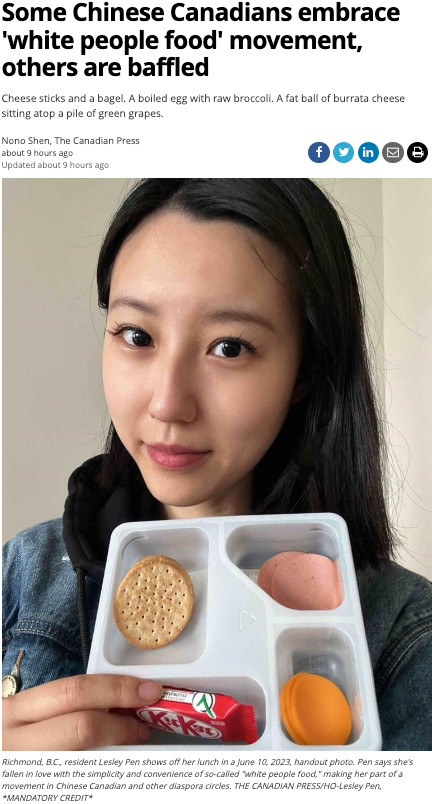 卑诗大学UBC社会学教授艾米·汉瑟(Amy Hanser)表示,“白人餐”运动象征着中国年轻人心态的转变。 加通社采访一名华人移民梁先生(Shawn Liang),梁先生六年前从北京移民到温哥华定居。 梁先生接受普通话采访时说,他曾经觉得“白人餐”这样的饭菜难以下咽。 但是,移民6年后,现在他喜欢上这种所谓的“白人餐”了。 现在,梁先生每天典型的午餐盒包括一个煮鸡蛋、新鲜西兰花、一片火腿、奶酪和一片全麦面包。 梁先生说,做中国菜既费时又费力,而且价格昂贵。 “但是,年轻人总是没什么钱、而且要努力工作而且没有什么时间,”梁说。 一盒饼干和冷盘可能听起来不值得大张旗鼓,但居住在列治文山的UBC大学的研究生 Lesley Pen最近在社交媒体上分享了一张带有中文“白人餐”标签的用餐照片。 Lesley Pen说,她“爱上了”这样的食物。 “与通常需要大量炒菜、严重依赖丰富的调味料和酱汁的传统中国菜相比,白人餐不需要这些,”卑诗省列治文居民Lesley Pen说。 Lesley Pen在UBC读研究生,主修食品、环境和经济。 “作为一个要独自生活,需要兼顾学业和工作的新移民,我觉得这些饭菜做起来既简单又方便,”Pen用普通话说,并补充说它们也是一种饮食选择。 Pen表示,“白人餐”是一个模糊的概念,但本质上意味着让膳食尽可能“省力、无浪费”。 在温哥华一家全球科技公司工作的吴女士( Eva Wu )说,她也是它的粉丝。 但吴女士并不称她的饭菜为“白人餐”,而是说这听起来“过于笼统和种族主义”。相反,她称这是“当地风味的清淡午餐”。 温哥华唐先生 (Richard Tang) 说,他每天都午餐吃新鲜水果和蔬菜,已经有五年了。 唐用普通话接受采访时说,他做的这顿简单饭菜有点像加拿大多元文化,会加入一片带芝麻的中式面包。 “这是我妻子用爱心做的,”唐笑笑道。“将我的车停在一个安静的街区,享用我的午餐并收听播客(podcast),这是我一天中最美好的时光。” 西蒙弗雷泽大学助理教授 Tammara Soma 同意“白人餐”这个词可能具有潜在的冒犯性。 然而,Soma 表示,这种趋势也可以被理解为一种“回收讽刺”(reclaiming the sarcasm)的方式,以展示不同的文化观点,因为来自非白人文化背景的人有时会因为他们自己的家乡食物“奇怪和异国情调”而被取笑。 对于这个,相信很多加拿大华人也有这个感受。 “事实上,通常对于非白人食物的被刻板印象,这有点像是相反反应,”Soma说。 对于白人自己传统引以为傲的餐饮文化遭到调侃,很多白人网友也开始急了。 “种族歧视。”