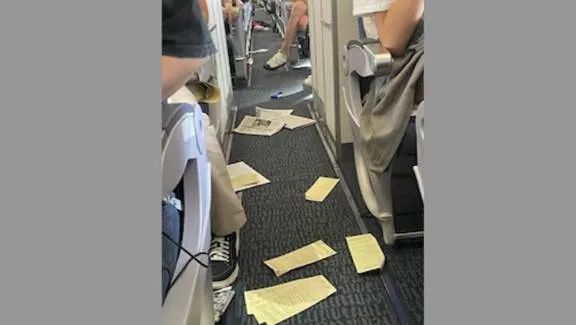 等飞机好不容易总算恢复了平静,地上杂物散落,空姐才把掉落在地上的贵重物品,如手机等一一拾起来,请乘客认领。