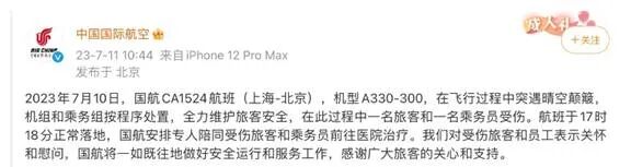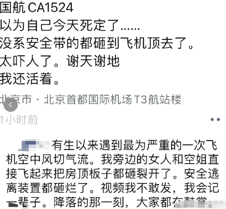 不仅如此,10日,“中国国际航空CA1524航班遇乱流严重颠簸”一度冲上热搜!空姐直接被甩飞,机舱天花板都被砸裂了!乘客都以为自己都要丧命!
