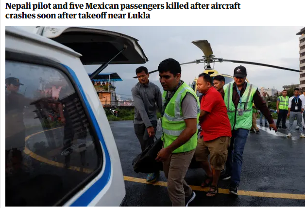 这架飞机上有6人,包括一名尼泊尔籍飞行员及5名墨西哥乘客,此行是载着游客前往圣母峰参观的,却没想到成了死亡之旅。