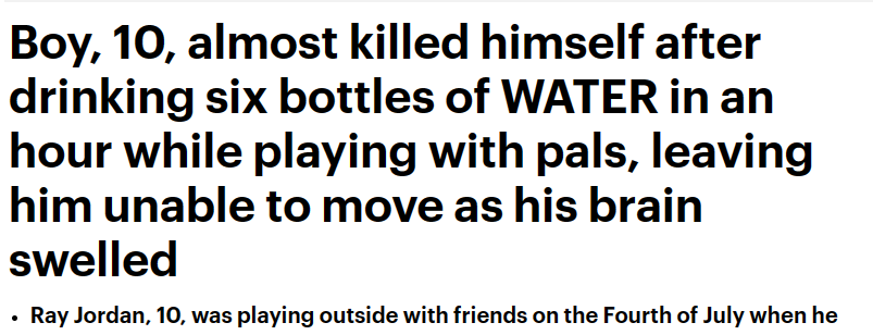 近日,美国就传出一名10岁男童因为实在是太热了,在1个小时之内连续喝了6瓶水,结果没想到出现中毒现象,当场昏迷,差点丧命!