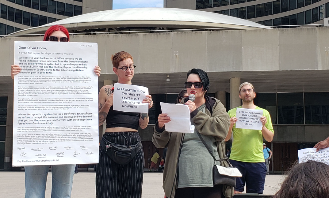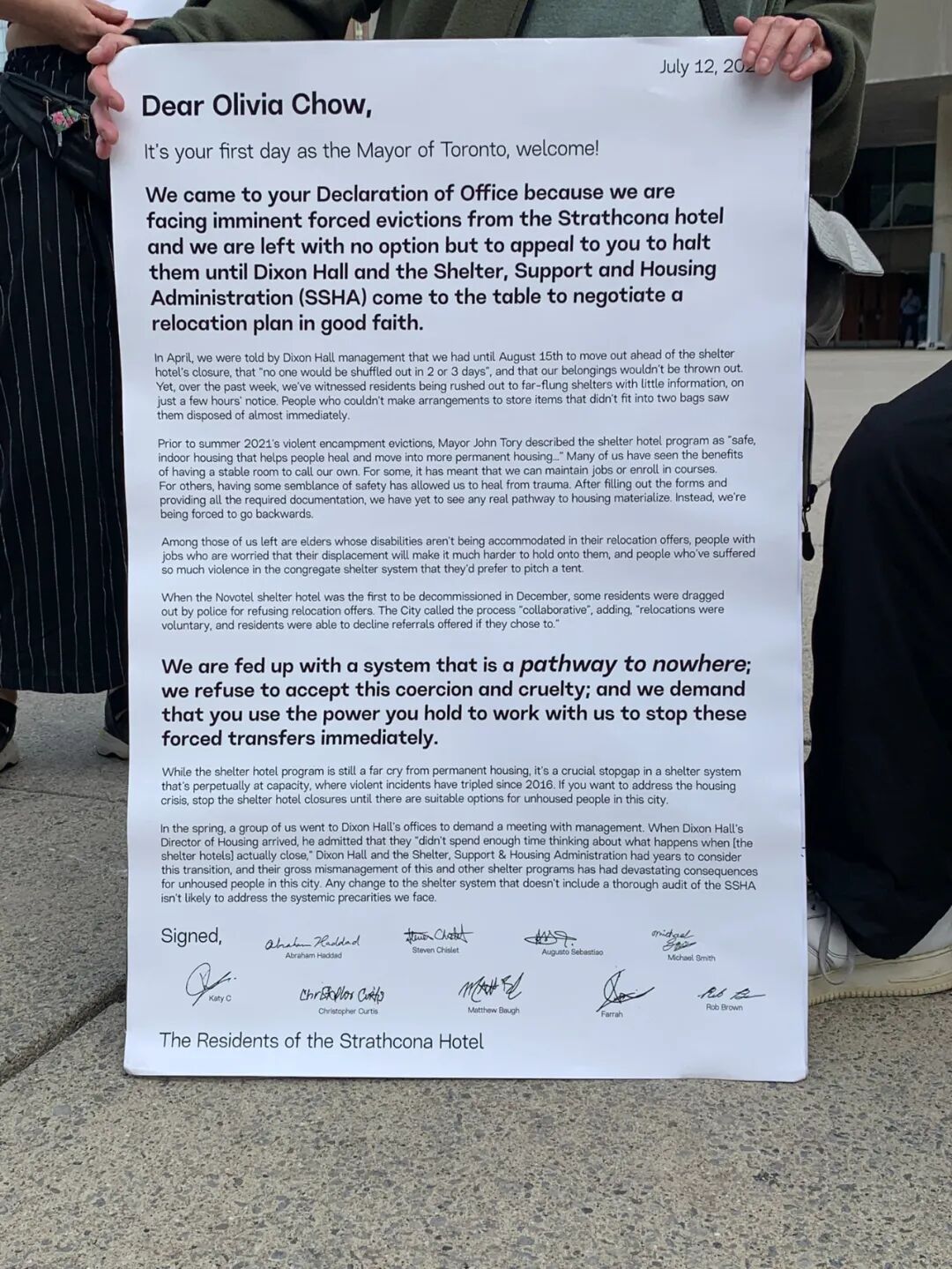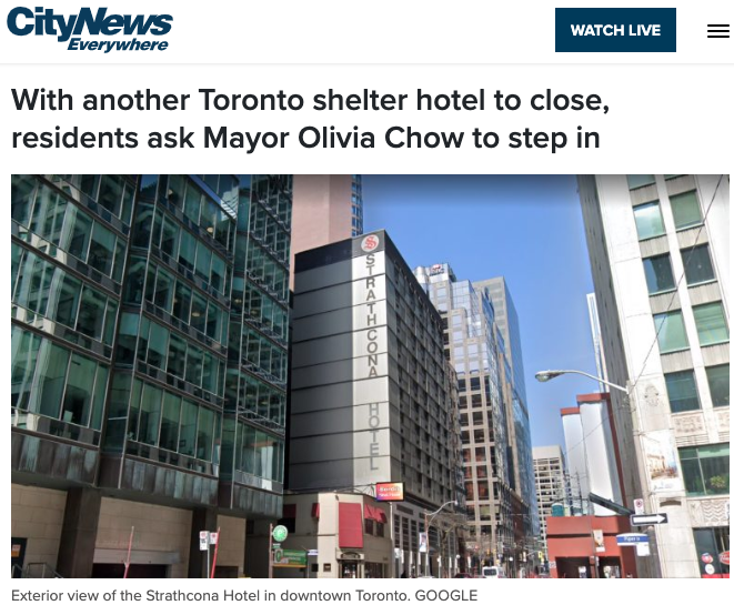 等到8月底,多伦多Union车站旁的豪华酒店Strathcona Hotel改成的庇护所将被关闭,重新恢复正常的酒店营业。然而许多正住在这里的无家可归者对这一改变并不满意。一些居住者还喊话多伦多的新市长邹至蕙,希望她可以介入,阻止关闭这间避难所。