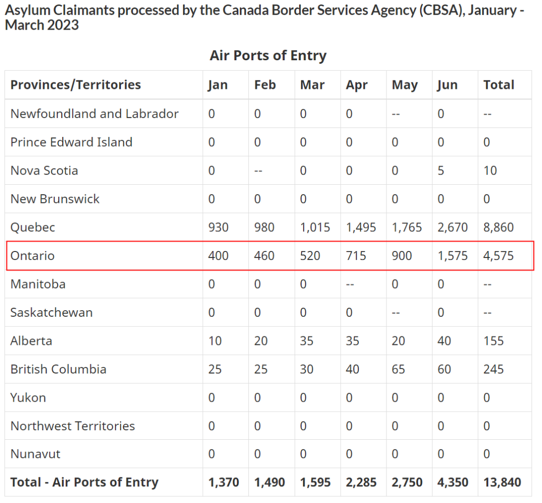 在2023年的前六个月,全国各地机场共有13,840人宣布自己是难民。而在整个2022年,总数为17,170人,除去去年,从2011年以来的记录中没有哪一年的数字超过了2019年的8,120人。其中,多伦多机场过去6个月的难民人数大幅增加了400%。