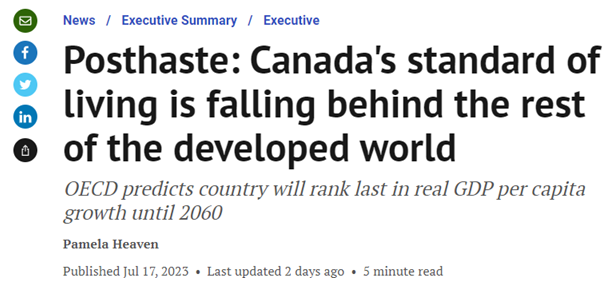 更令人担忧的是,经济合作与发展组织(OECD)预测,在 2060 年之前,加拿大的实际人均国内生产总值增长将在经合组织成员国中垫底。