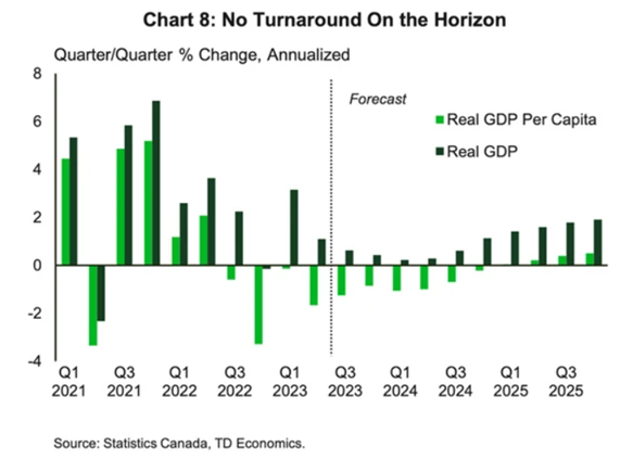 实际人均国内生产总值这一指标在过去三个季度出现萎缩,道明银行预测,该指标将持续萎缩,直至 2024 年底。