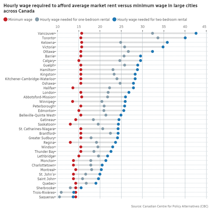 渥太华智库加拿大政策替代中心(CCPA)分析涵盖了全国37个主要城市的776 个社区,计算出人们每周工作 40 小时必须赚多少钱才能支付不超过其收入30% 的住房费用,而住房费用是他们收入的 30%,称为“租金工资”。