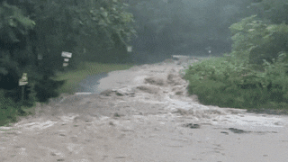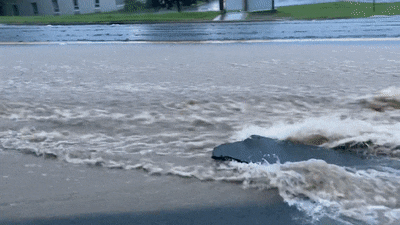 当洪水冲刷自家旁边的马路,拄着拐杖的老爷爷丝毫不惧,下水探测。