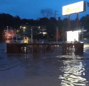 街道看着看着就被淹没成河,有餐馆的露台就这样被冲走,如同一叶扁舟。