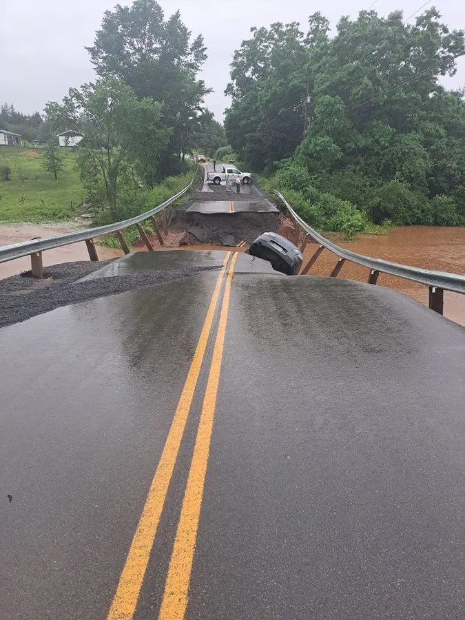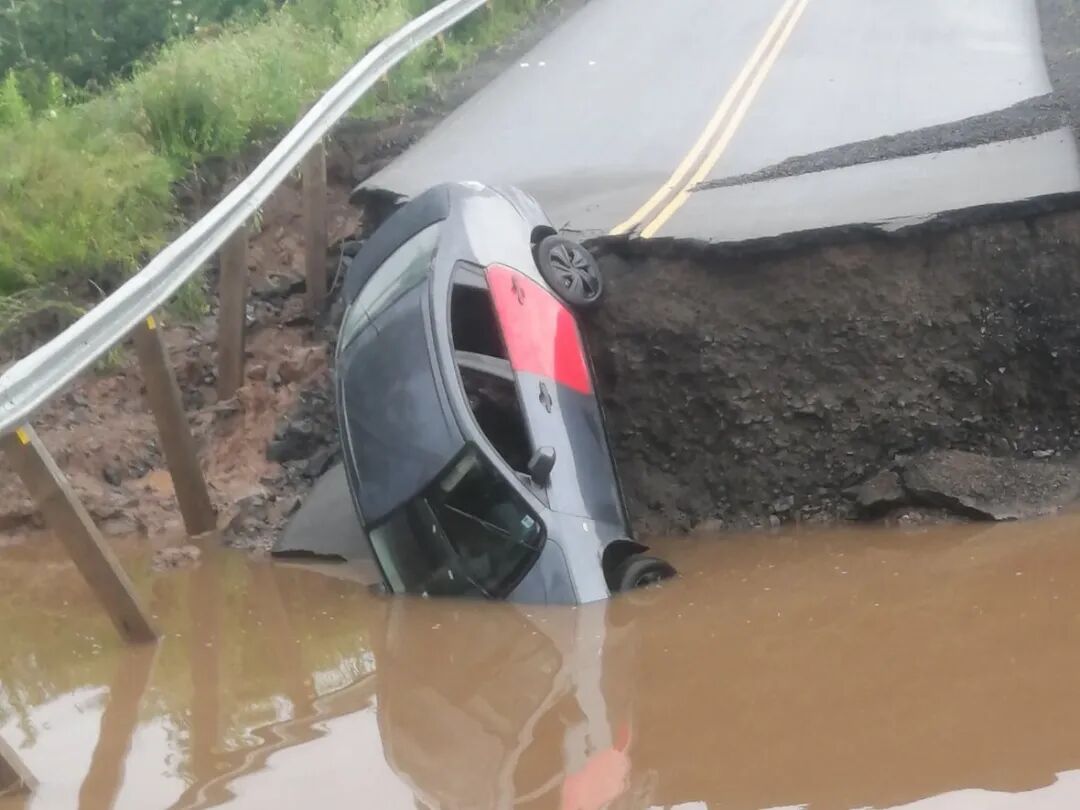 一些公路被水冲毁,一头扎进深坑的汽车,不知道其主人命运如何
