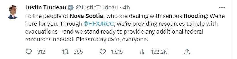 今天,加拿大总理特鲁多在推特上和电视上都公开表态,了解了新省的灾情,将提供支持和援助,希望所有人保持安全。