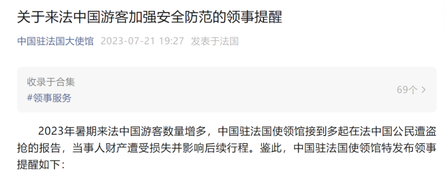 大使馆发文指出,2023年暑期来法中国游客数量增多,中国驻法国使领馆接到多起在法中国公民遭盗抢的报告。特发布提醒如下: