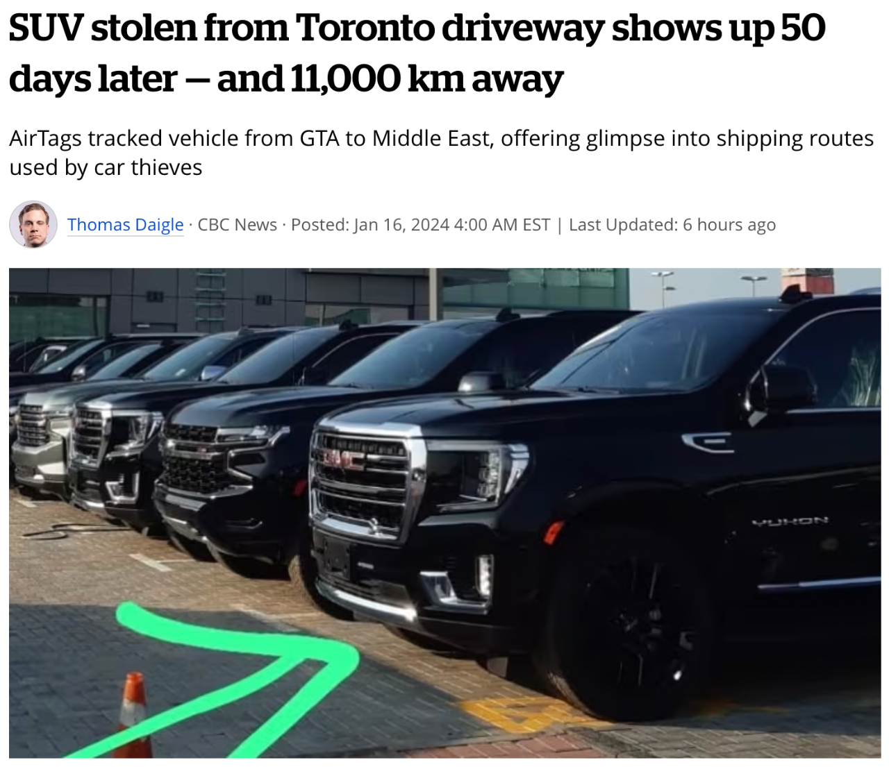 去年八月的周一,多伦多居民 Andrew 只是吃了一顿晚饭的功夫,他停在自家车道上的 2022 款 GMC Yukon XL SUV 就不见了!那是他在这一年里第二辆被盗的车,中间只隔了三个月! Andrew 使用隐藏在车内的 Apple AirTags,追踪 2022 GMC Yukon XL 到附近的铁路站,然后到蒙特利尔港,最后到阿拉伯联合酋长国的一个二手车停车场。