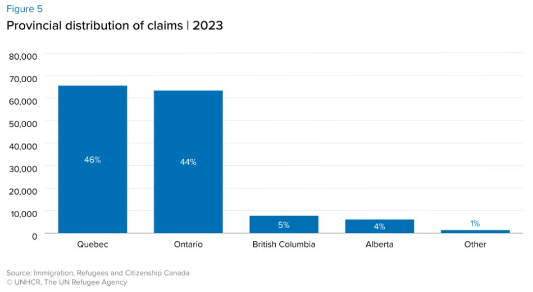 根据联合国难民事务高专署(又称联合国难民署)周四发布的最新全球趋势报告,加拿大在2023年收到了14.68万份新申请,高于前一年的9.4万份。仅低于四个国家:美国(120万人)、德国(32.91万人)、埃及(18.31万人)和西班牙(16.32万人)。