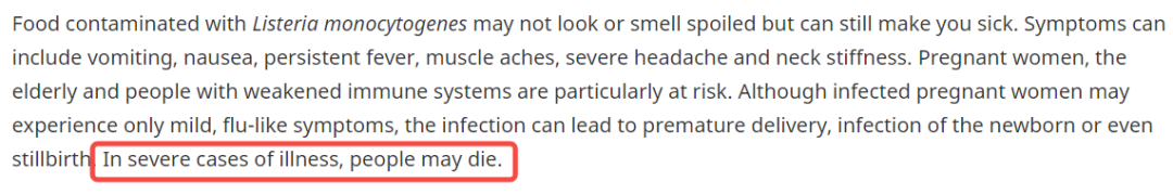 这种疾病通常不会在人与人之间传播,但免疫系统较弱的人、 60岁以上的成年人和孕妇(包括胎儿或新生儿)患李斯特菌病并发症的风险较高在严重的情况下,可能导致死亡。