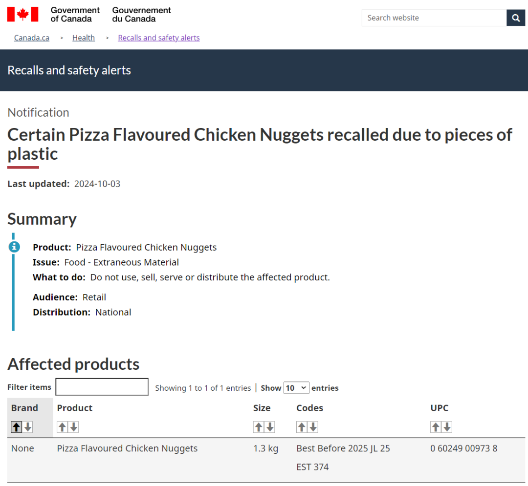 4. Sofina Foods Inc.公司召回一款披萨味冷冻鸡块,原因是可能含有塑料碎片。该产品在Loblaw旗下超市出售(即Real Canadian Superstore、No Frills、Zehrs)。