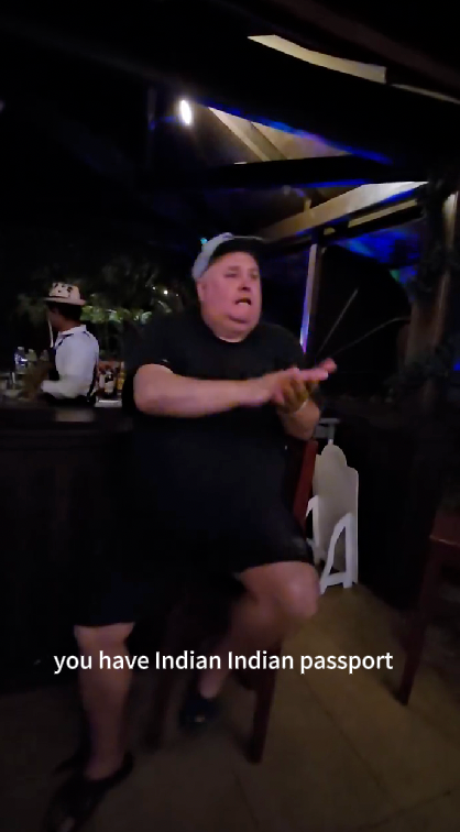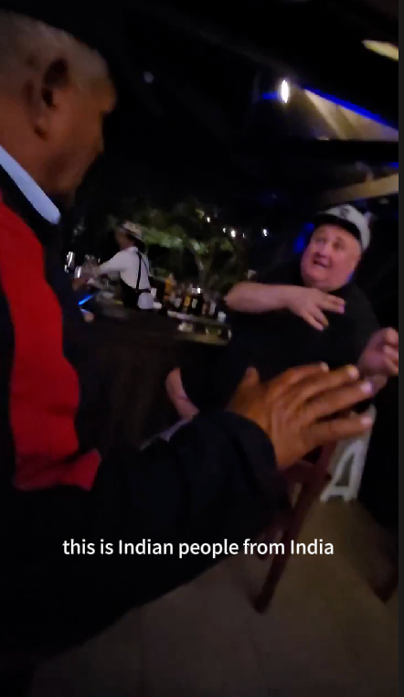 在一段时长一分钟的视频中,可以看到一名男子坐在酒吧椅上,与画面外的人交谈。他提到,“我来自加拿大。我没问题。看看,这是印度人,他们有某种复杂的优越感,认为自己比我、比你更好。”