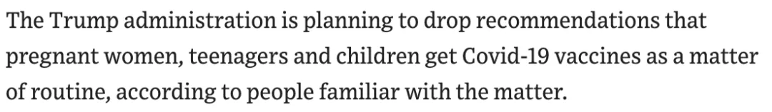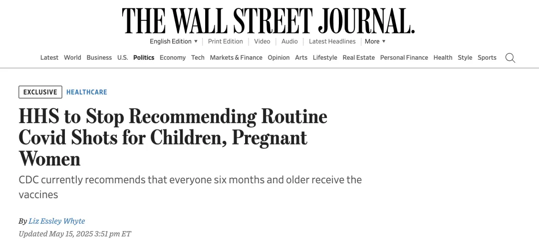 据《华尔街日报》,美国卫生与公众服务部(HHS)正重新调整现行新冠疫苗接种政策,计划取消对孕妇、青少年和儿童常规接种的推荐。
