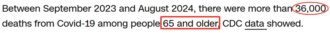 CDC数据显示,尽管随着群体感染与疫苗接种,新冠的致死率已远低于疫情高峰期,但对老年人仍然存在较高风险。2023年9月至2024年8月间,65岁以上人群中仍有超过3.6万人死于新冠。  信息截取自CNN.com