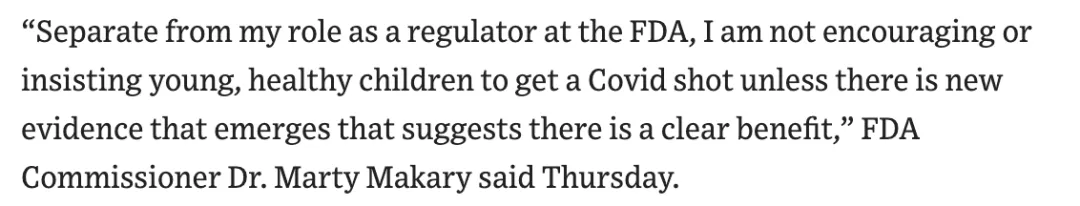 FDA局长于周四表示,“除了我作为食品药品监督管理局监管者的职责之外,我并不鼓励或坚持要求年轻、健康的儿童接种新冠疫苗,除非有新的证据表明接种疫苗有明显的好处。”