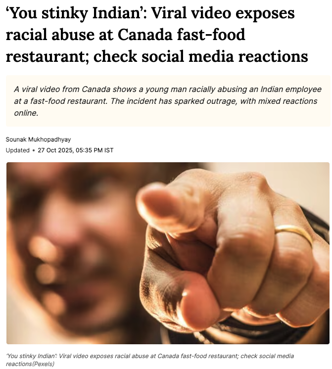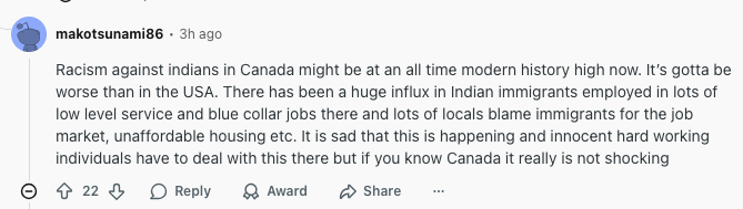 "现在加拿大针对印度裔的种族歧视可能达到了现代史的最高点,甚至比美国还严重。最近大量印度移民进入加拿大,从事低薪服务业和蓝领工作,很多本地人把就业压力、房价高涨都怪到移民头上。这真的很让人难过,那些勤劳无辜的人要面对这样的事。但如果你了解加拿大,这种情况其实并不让人意外。"