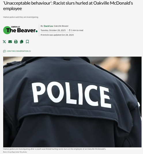10月24日晚9点左右,安省中产聚居区奥克维尔(Oakville)的一家麦当劳餐厅内发生一起引爆网络的事件:一名青少年在店内当众对一位印度裔员工爆出种族歧视性辱骂,包括粗口与“滚回你的国家”等言语。