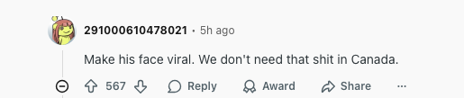 "让他那张脸火起来吧。这种人渣,我们加拿大不需要。"