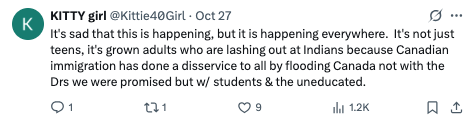 "这件事确实让人难过,但现在这种情况到处都在发生。说这些的可不只是青少年,还有许多成年人也在辱骂印度人。 因为加拿大的移民政策让大家都受到了伤害,我们被承诺会迎来医生,结果却引进了一大批学生和没受过教育的人。"