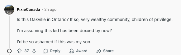 这是安省的奥克维尔吗?如果是的话,那可是一个非常富裕的社区,孩子们大多出身优渥。我猜这个孩子现在已经被人肉了吧?如果那是我儿子,我会感到无地自容。