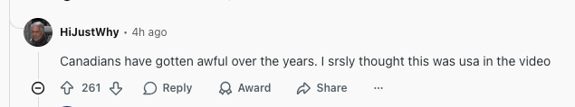 "加拿大人这些年变得越来越糟。我认真地以为视频里的场景是在美国拍的。"