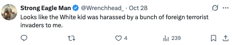 “在我看来,是那个白人孩子被一群外国恐怖分子骚扰了。”