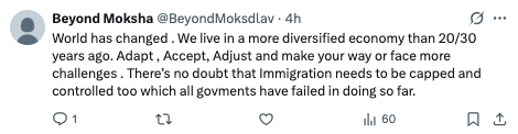 “世界变了。我们现在的经济比二三十年前更加多元。要学会适应、接受、调整,否则就会面对更多挑战。不过毫无疑问,移民也确实该受到限制和管理。所有政府到现在都没做到这一点。”