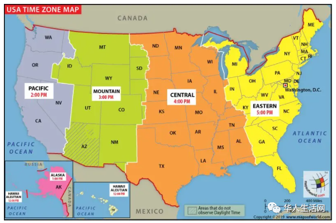 注意!改为冬令时后,美国各时区与中国的时差也相应调整。 Eastern Time/美东时间(纽约、迈阿密等)时差为-13小时,Centrral Time/中部时间(芝加哥、休斯顿等)时差为-14小时,Mountain Time/山地时间(丹佛、凤凰城等)时差为-15小时,Pacific Time/太平洋时间(洛杉矶、拉斯维加斯、西雅图等)时差为-16小时,Alaska Time/阿拉斯加时间时差为-17小时。Hawaii–Aleutian Time/夏威夷时间时差为-18小时。