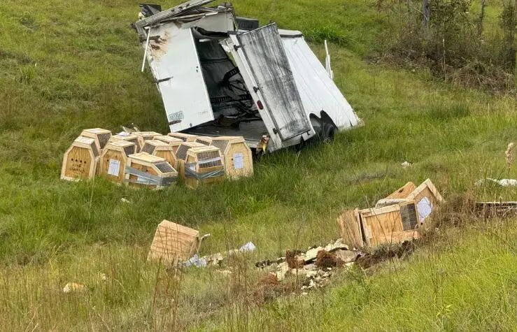 据目击者描述,卡车在撞击护栏后滑下路基,后备箱在巨大的冲击力下被摔开,装载的笼子散落一地。