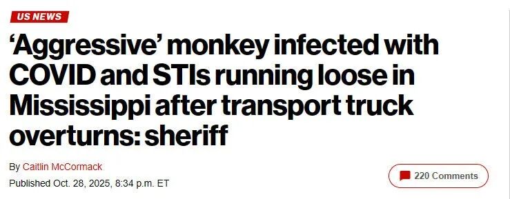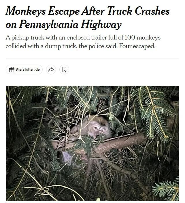 2022年1月21日,宾夕法尼亚州一辆运送100只猴子的卡车与垃圾车相撞,4只猴子逃脱。美国疾控中心罕见地介入协助搜寻,最终通过媒体警告民众"切勿靠近"。