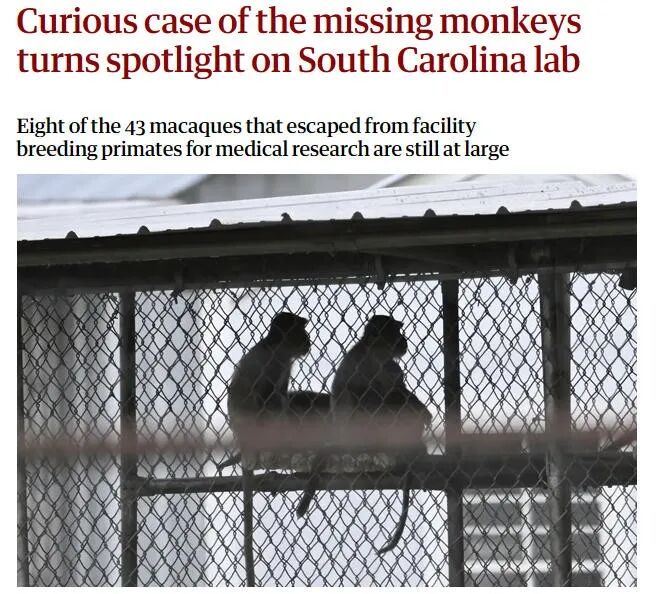 2024年11月7日,南卡罗来纳州"阿尔法起源"医学研究机构的43只猴子因管理员疏忽集体出逃。