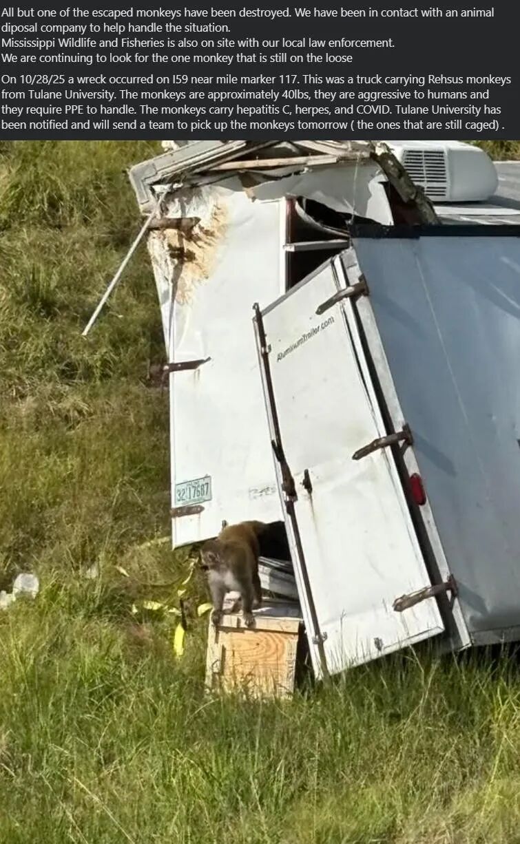 据官方通报,车上共有21只猴子,其中6只在事故中逃脱。截至目前,已有5只被击毙,但仍有1只在逃。